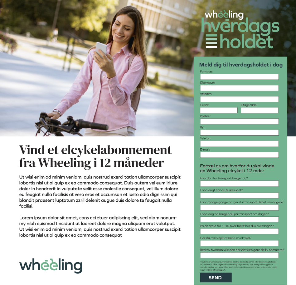 Solution: We introduced Hverdagsholdet. A team of ordinary people, just like you and I, who want more time in their everyday life. We knew through research, that as soon as you get on an electrical bike, it exceeds your expectations. Through a sign-up, we wanted to invite 8 'Århusianere' to participate on the team and sponsor their bikes, so that would have more time to themselves. Through different questions regarding their day-to-day biking patterns, Wheeling will pick 8 winners to have a sponsored bike for a year.
