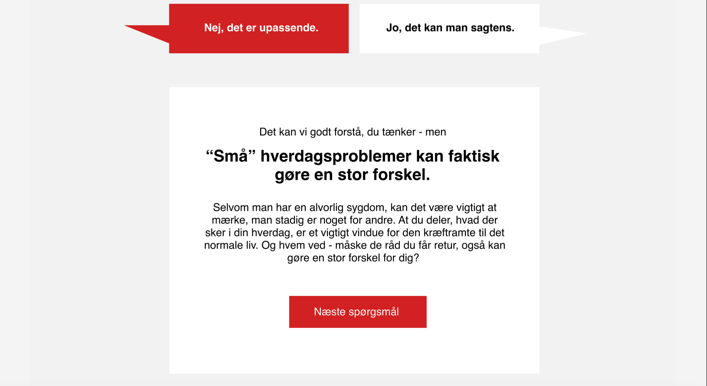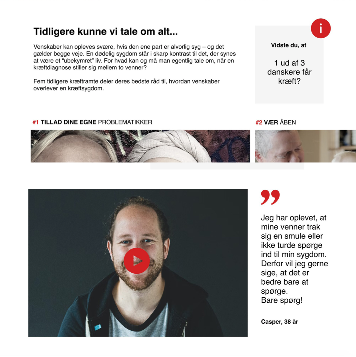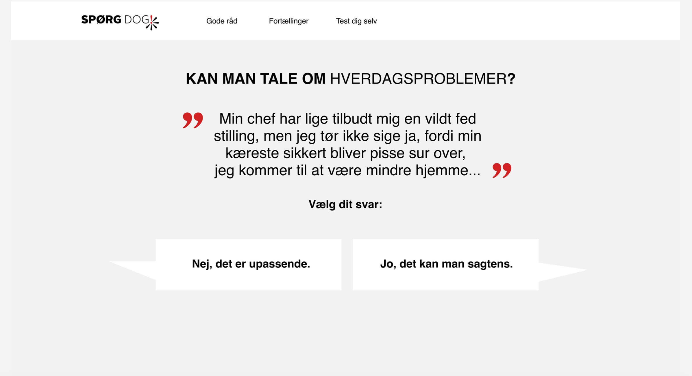 Solution: We wanted to encourage relatives of people with cancer to ask the difficult questions. With the new campaign name “Spørg Dog!”, we created a website to work as a guide for people with sick relatives. Through tests, tips & tricks and testimonials, the target group will find it easier to get ahead of these important conversations, which ultimately will make the progress of the sickness easier to cope with – for the sufferer and relatives.